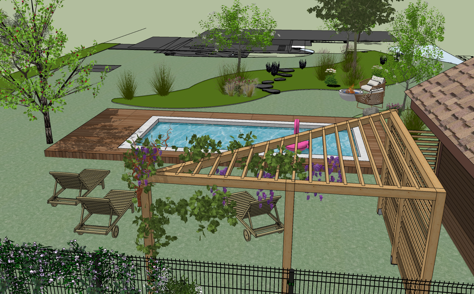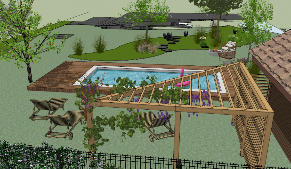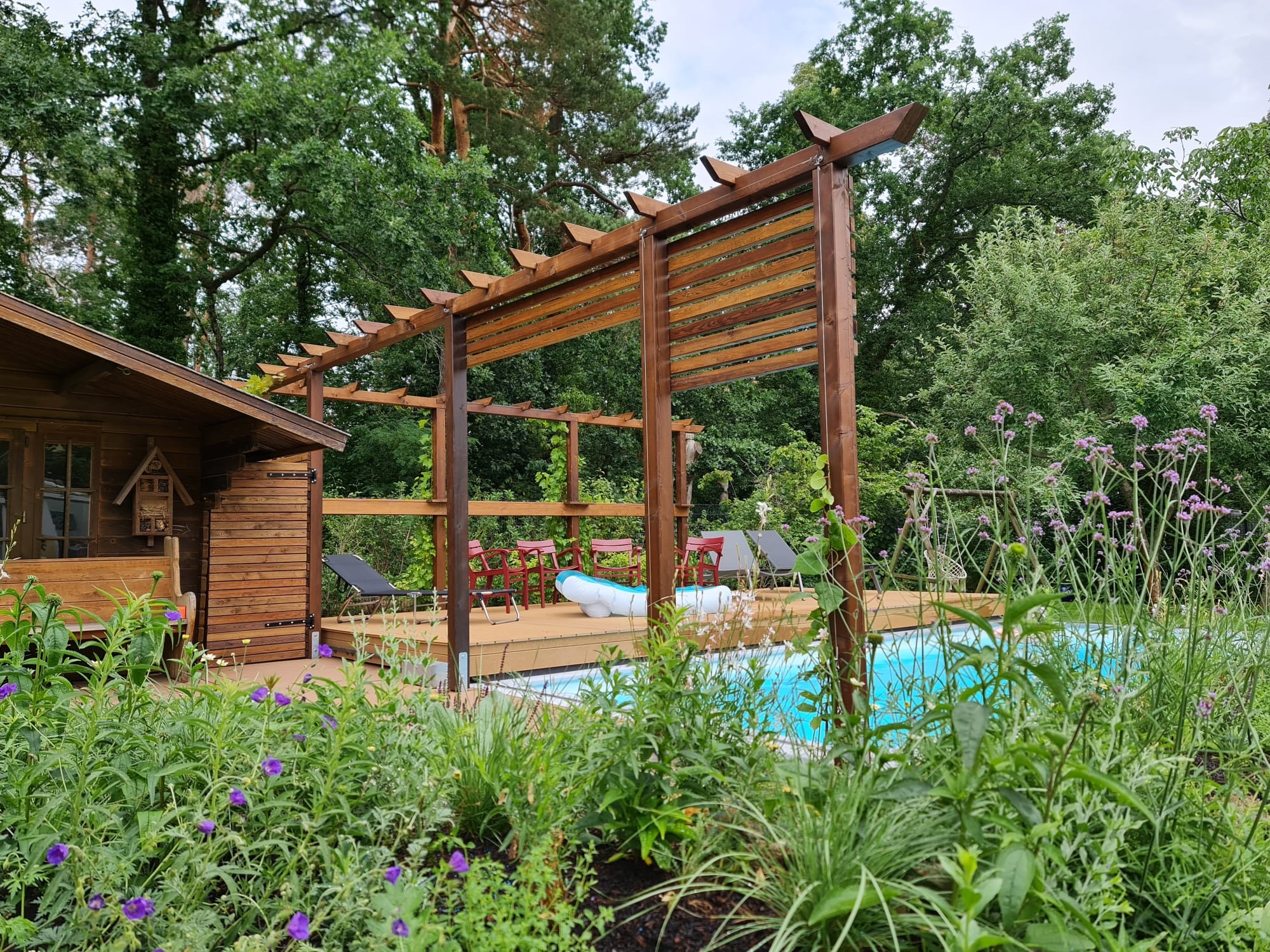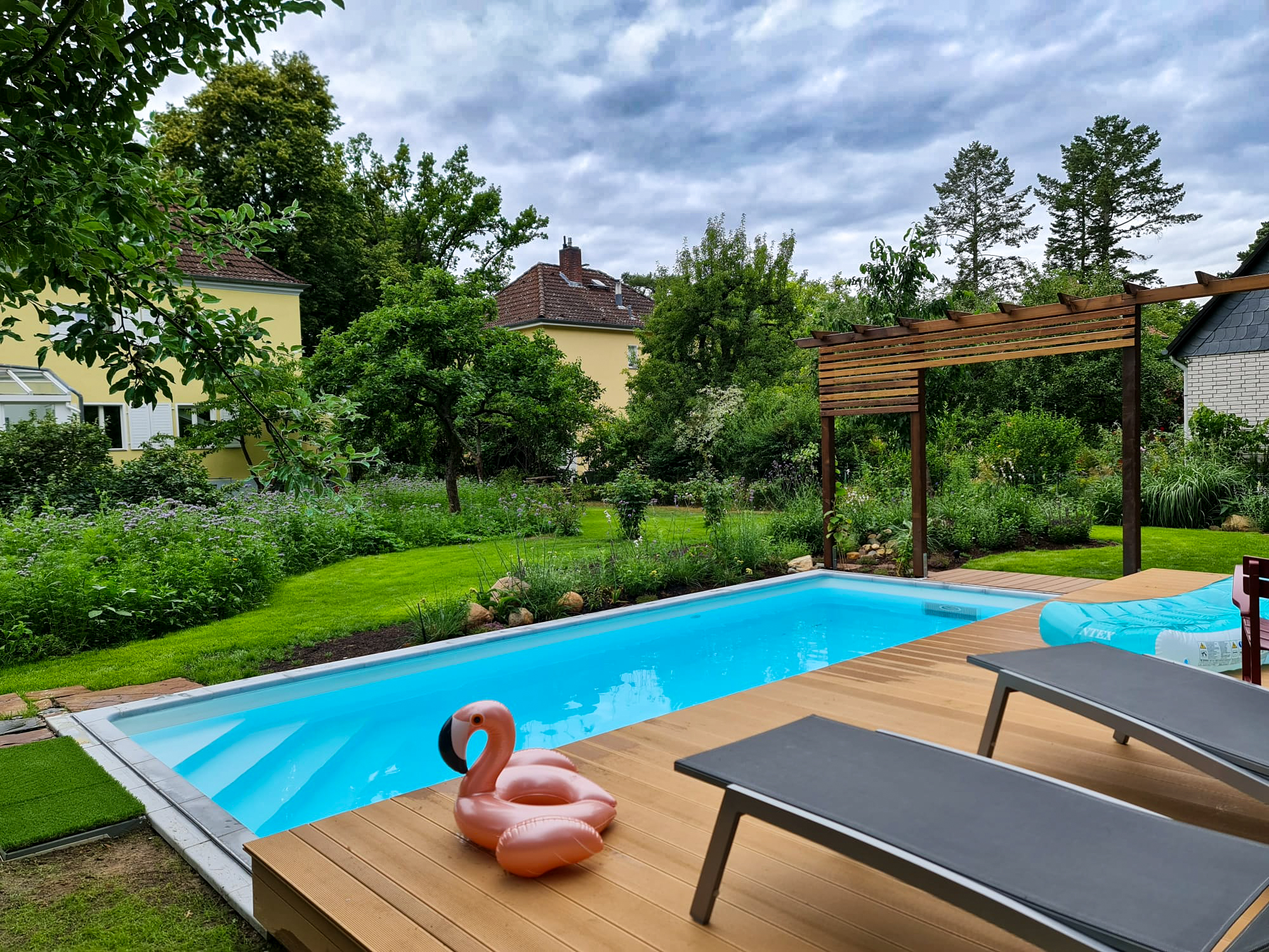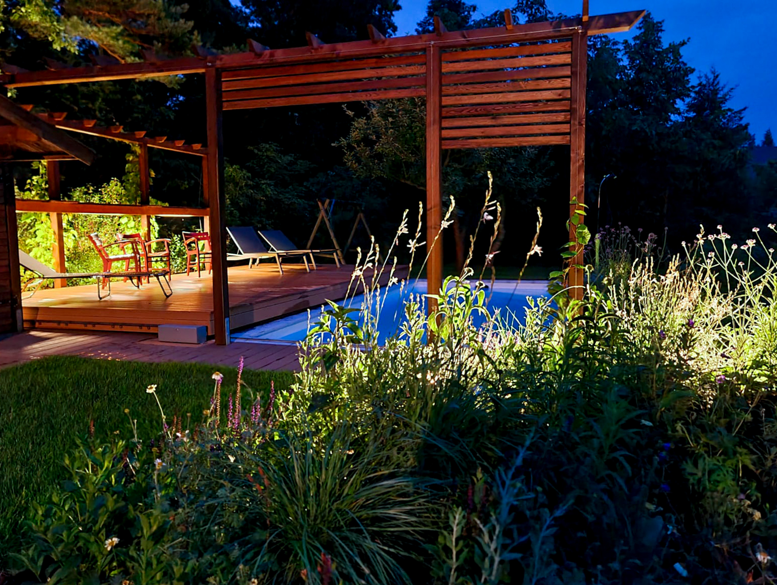 Bei diesem Projekt erwartete mich ein uriger Garten in Berlin Zehlendorf mit alten Obstgehölzen und Blick in den Wald. Die Kunden haben sich in Teilbereichen Struktur im Garten gewünscht die verschiedene bestehende und neue Elemente miteinander verbinden sollte. Pool, Gartenhaus und Obstgehölze wurden miteinder verbunden und durch großzügige Staudenbeete, ein bewegliches Holzdeck und eine beleuchtete Pergola erweitert.